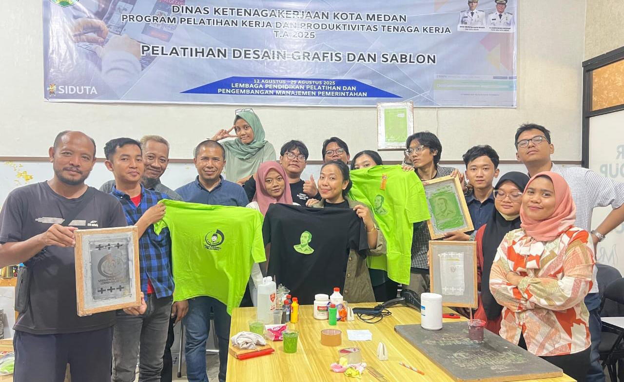 MEDAN, SUMUTCENTER.COM — Suara mesin press kaos terdengar bersahut-sahutan dari sebuah ruangan sederhana di Training Café MR Kuphi, Jalan Beringin Raya, Gaperta, Medan Helvetia. Di sana, 20 wajah penuh semangat duduk serius di depan komputer, sesekali tertawa kecil saat mencoba mengutak-atik desain di layar. Mereka bukan mahasiswa seni rupa, melainkan para pencari kerja Kota Medan yang tengah berjuang menemukan jalan hidup baru lewat keterampilan desain grafis dan sablon.